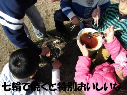 今日の午後,グラウンドで昔の道具(七輪)を使ってお餅を焼きました。昔の道具の使い方を知り,その良さまた大変さに気付けた学習になりました。