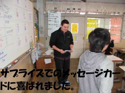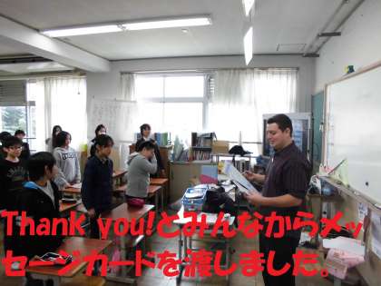 6年生は,夢宣言のリスニングや復習ゲームを行い,最後まで英語に慣れ親しむことができました。授業の最後には,今までの感謝の意を込めてメッセージカードを渡しました。サプライズプレゼントに大変喜んでおられました。