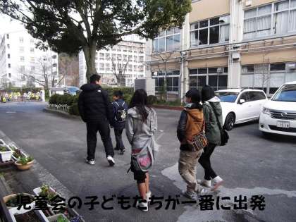 8時30分,児童会の子どもたちが集合し,先に栗陵中学校に向いました。