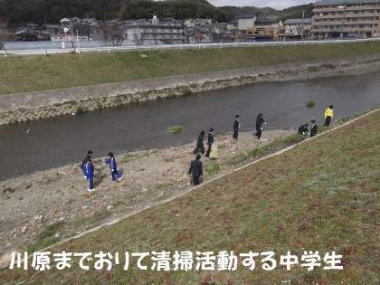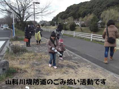 小中学校のPTA役員さん,地域の皆さん,そして,子どもたちも参加して山科川堤防道を中心にごみ拾いをしました。