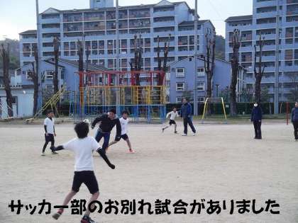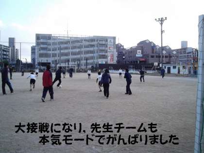 雪がちらつく寒い日になりましたが,今日は,待ちに待ったサッカー部のお別れ試合です。6年生チーム対先生チームの真剣勝負がはじまりました。