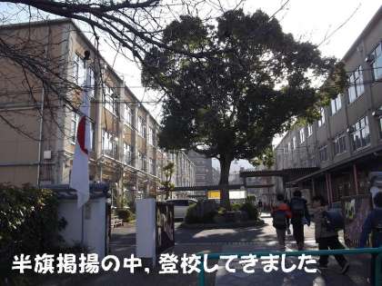今日は,被害日本大震災から3年目にあたります。京都市立学校では,被災された皆様に対する哀悼の意を表するため,半旗を掲揚しています。