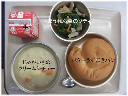 お詫び:画像の「バターうずまきパン」と「じゃがいものクリームシチュー」の置き方が反対になっています。申し訳ありません。