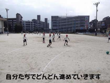 体育のキックベースで,もりあがっています。先生の指示で動くのでなく,自分たちで試合をどんどん進行しています。