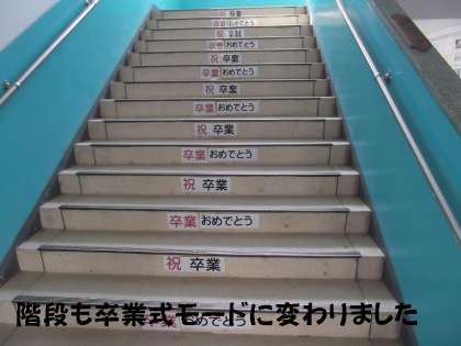 各学年の掲示板はもちろんのこと,階段掲示も「祝 卒業」「卒業おめでとう」です。