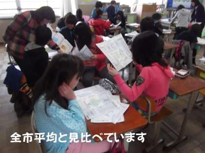 全市平均と自分の成績が比較できます。子どもたちは,成績グラフを見比べながら,友だちどうしで話し合っていました。
