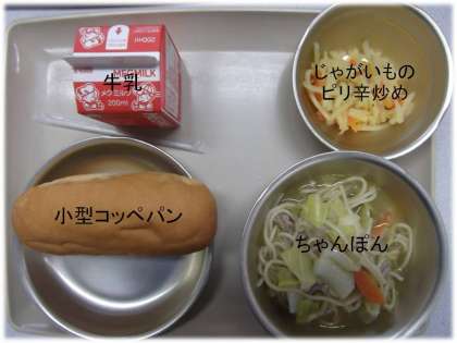 今日の給食には,ぶたにくやいか,かまぼこ,野菜など,たくさんの具が入っていました。