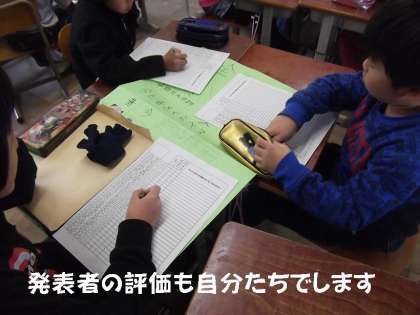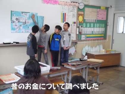 「昔のお金」「昔の子どもの遊び」「昔の食べ物」「・・・・?」など,グループを組んで調べました。中には一人でテーマを決めて,調べた人もいました。発表後の評価も,自分たちでしていました。