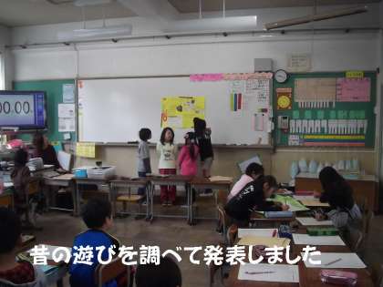 「タイムスリップすると??」昔の生活の様子や遊びについて,子どもたちが自ら調べたことの発表会がありました。