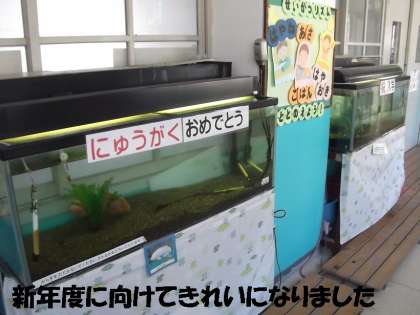 明日からの新年度に向けて,保健室前の鑑賞魚の水槽の水替えをしてやりました。現在,大型肉食熱帯魚「オスカー」が1匹と,金魚(コメット,和金)が2匹しかいませんが,5年以上大事に飼育しています。「オスカー」は,5センチから約25センチまで大きくなっています。