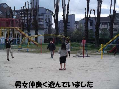 サッカーやバレーボールなど,異学年の子どもたちが男女仲良く遊んでいます。今年卒業した6年生も交じっていました。