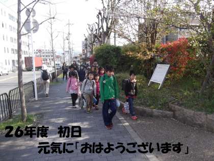 いよいよ26年度がスタートしました。初日の集団登校で,元気いっぱいの子どもたちの姿を見られ,うれしく思います。