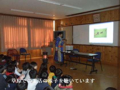 今日は,馬頭琴奏者でモンゴル人のタイピンさんを学校にお招きして,スーホーの白い馬の舞台になった,モンゴルの草原での生活のお話や民族服を着て「馬頭琴」の生演奏を聴かせていただきました。こんな経験は,めったにできることではないので,子どもたちは感激していました。