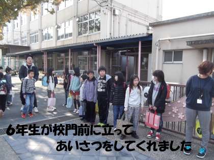 集団登校で早く来た6年生が,校門前で笑顔で出迎えてくれました。