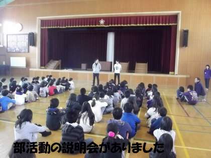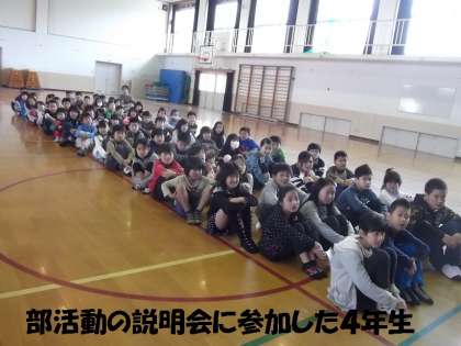 中間休みに部活動の説明会がありました。体育館に4年生以上の子どもたちが集まり,今年度開設する8つの部活動「バレーボール部」「バスケットボール部」「卓球部」「サッカー部」「ソフトボール部」「すもう部」「音楽部」「図工部」の各担当の先生から活動の内容の説明がありました。