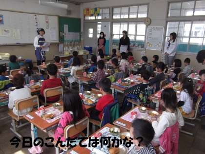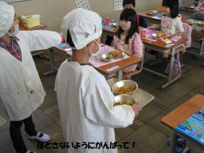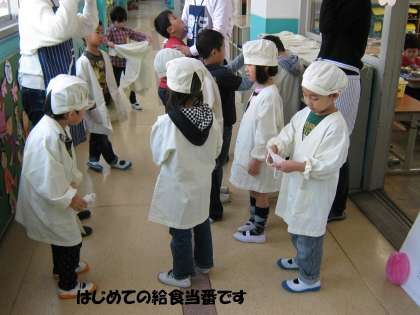 まず給食当番の仕事を覚えます。そして配り終えたら,献立の説明を聞きました。