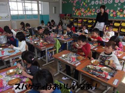 子どもたちの大好きな「ミートスパゲティ」そして,少し苦手な「ホウレンソウ」も出ましたが,がんばって食べていました。