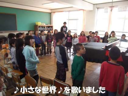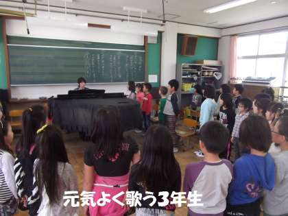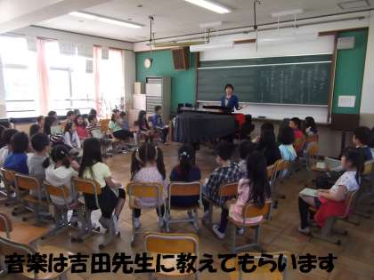 音楽の時間は,ピアノが上手な吉田先生に教えてもらっています。担任の田崎先生は,子どもたちと一緒に大きな声で歌っています。