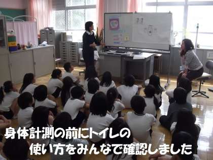 身体計測の前に,トイレの使い方の確認をしました。大便をしたあと,便器が汚れたり,流してない場合があるので,保健室の先生からお話(注意)がありました。