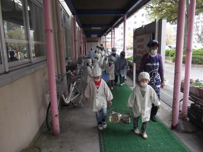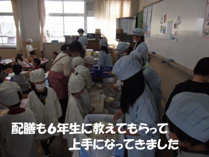 給食室に行くのも,配膳をするのも,6年生がついてくれています。日に日に上手に休息当番ができるようになってきました。