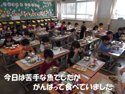 今日は,1年生の子どもたちが苦手な「魚」でしたが,栄養教諭の北山先生に食べ方を教えてもらって食べていました。