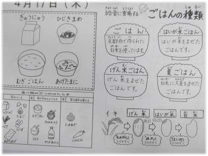 「むぎごはん」「あげ玉煮」「ひじき豆」「牛乳」