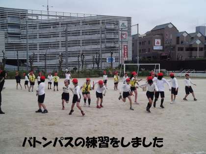 リレーのバトンパスの練習をしました。いかにタイムのロスを少なくしてバトンパスをするかがポイントです。