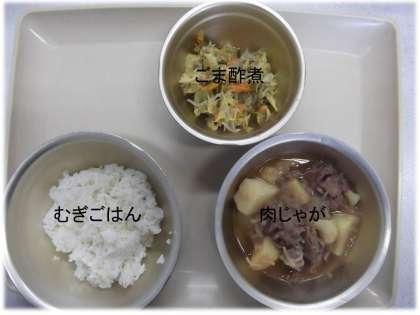 「むぎごはん」「肉じゃが」「ごま酢煮」