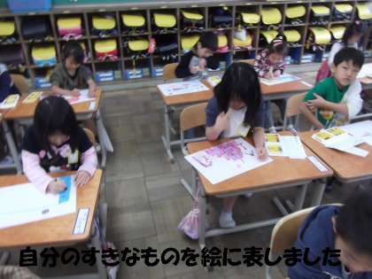 入学して初めて教科(図工)として,絵に取り組みました。これまでは,お絵かきの時間はありましたが,今日は,教科学習「すきなものなあに?」で,好きなもの,見つけたもの,あったらいいなと思ったものを,自由に描きました。