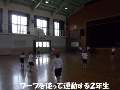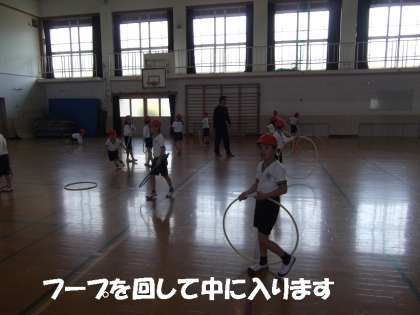 合同体育で一人一人がフープを使って運動をしました。フラフープとして腰でくるくる回したり,なわとびのようにフープとびをしたり,フープの中をくぐりぬけたり,いろいろ子どもたちが考えて活動しました。