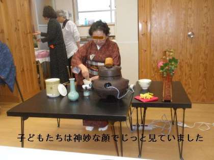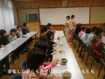 おいしい茶菓子をいただいたあと,みんなにお茶がふるまわれました。子どもたちは,緊張しながらもいい経験をして満足していました。