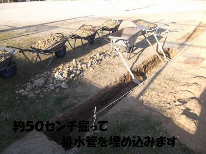 昨日から運動場南(ビオトープ側)の暗渠(あんきょ)排水工事をしていただいていますが,運動場を約50センチ掘り,塩ビの排水管を埋め込んでバラスを敷く工事です。