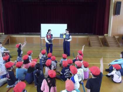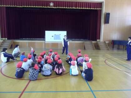 3校時に交通安全教室が行われました。前半は,体育館で山科署の警察官の方より,横断歩道の渡りかたや信号機についての話などを子ども達に分かりやすく説明していただきました。「子ども達は,交通ルールがよく分かった」「これから横断歩道を気をつけて渡ろうと思います。」など感想を言っていました。