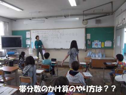 1組は国語「生き物はつながりの中に」,2組は算数「分数×分数」,朝一番から難しい学習に取り組んでいます。