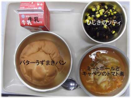 「バターうずまきパン」「ミートボールとキャベツのトマト煮」