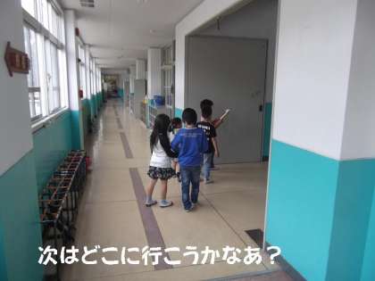 今日は,学校たんけんの日です。朝から2年生は1年生を連れて,学校を案内しました。16班に分かれて校舎内を回りました。