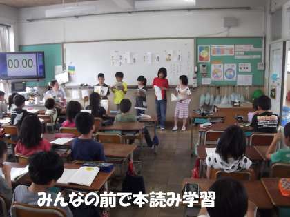国語の時間に音読発表会をしました。みんなの前に立って音読するのは,少し緊張しましたががんばりました。発表後,聞いていた友だちから感想(批評)ももらいました。
