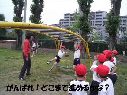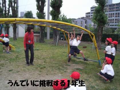 「うんてい」ではどれだけ進めるか?一人一人挑戦しました。長いうんていのはしからはしまで進める1年生がいてびっくりでした。