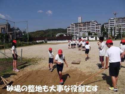 砂場を整地して,今日はふみきり板を使ってジャンプする感覚をつかみました。片足踏み切り,両足着地ができると記録ものびてきます。