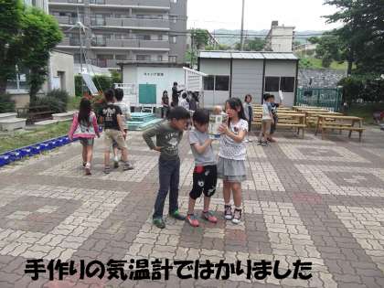 理科学習で「天気と気温」の学習をしています。今日は手作りの気温計(温度計)で太陽と気温の関係を調べました。