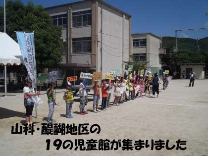 全部で19の児童館の子どもたちが集まり盛大に行われました。中山児童館,醍醐中央児童館の子どもたちも元気いっぱい笑顔で参加していました。