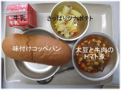 「味付けコッペパン」「大豆と牛肉のトマト煮」