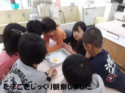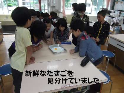 5年生になって,最初の調理実習は「ゆで卵」です。今日は,事前に新鮮なたまごの見分け方を習い,ゆで卵のでき方も観察しました。