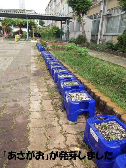先週に発芽した1年生のあさがおが順調に育っています。平日は毎朝,子どもたちがペットボトルじょうろで水やりをしています。