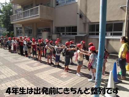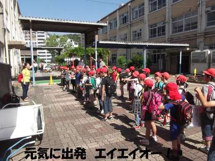 4年生は出発前に,「エイエイオー」とかけ声を3回かけました。暑い中,大津から山科まで山越えをがんばります。