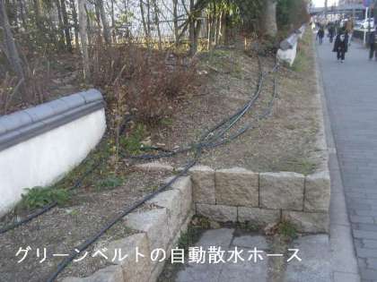 朝も紹介しましたグリーンベルトには,自動散水装置が設置されています。1日2回(10時と15時)時間が来たらホースから水が出てきます。夏にはかかせない散水装置です。
