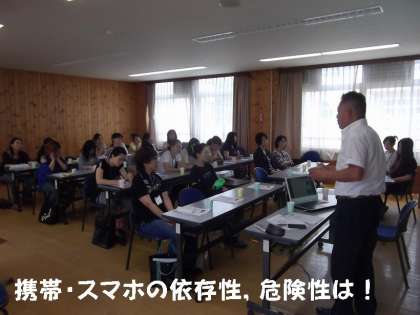 「ペアレントコントロール・規範意識を育むために」というテーマで,本校の森川教頭先生が,携帯・スマホの依存性,危険性について講演しました。
