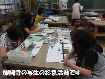 醍醐寺の写生の絵の彩色活動をしていました。授業の図工の時間とはちがった雰囲気でみんな楽しそうにおしゃべりしながら活動していました。