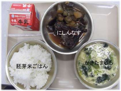 「胚芽米ごはん」「かきたまじる」「にしんなす」「牛乳」