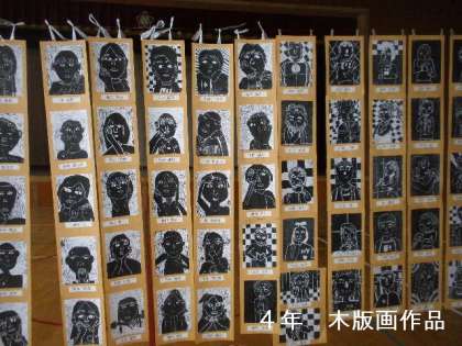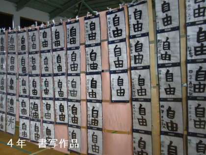 4年生は初めての木版画・線彫りの作品です。そして,書き初めか「自由」です。